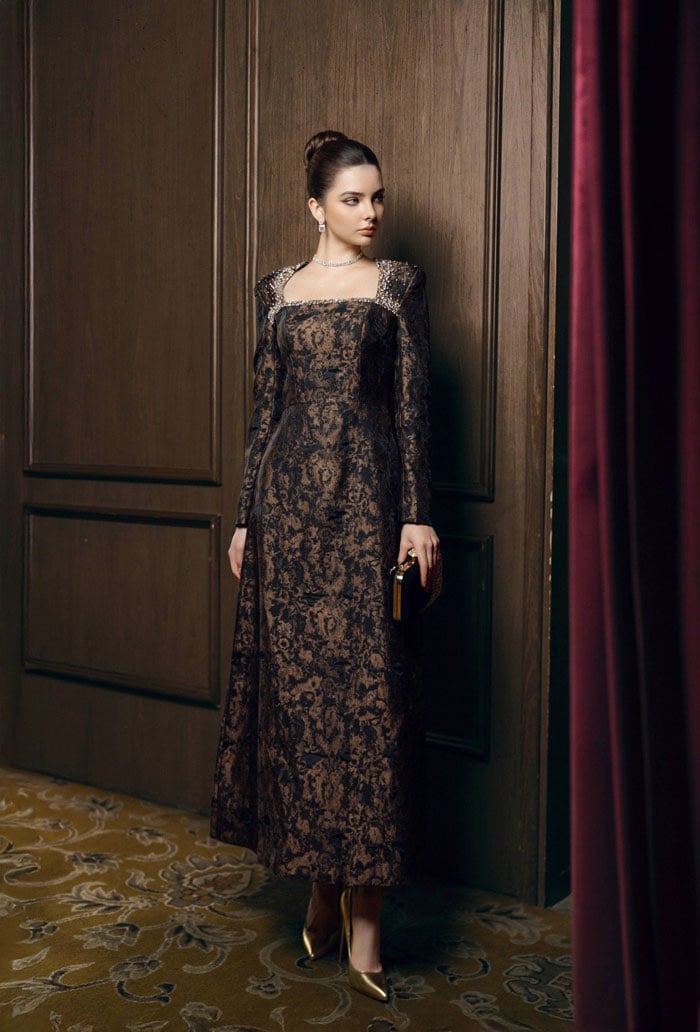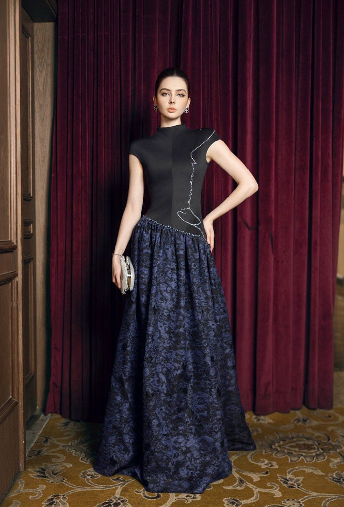 Cổ choker đính đá là điểm nhấn đặc biệt của mẫu đầm dạ hội trung niên đẹp. Những viên đá lấp lánh được sắp xếp một cách tỉ mỉ trên chiếc choker rực rỡ và sáng chói, thu hút mọi ánh nhìn.