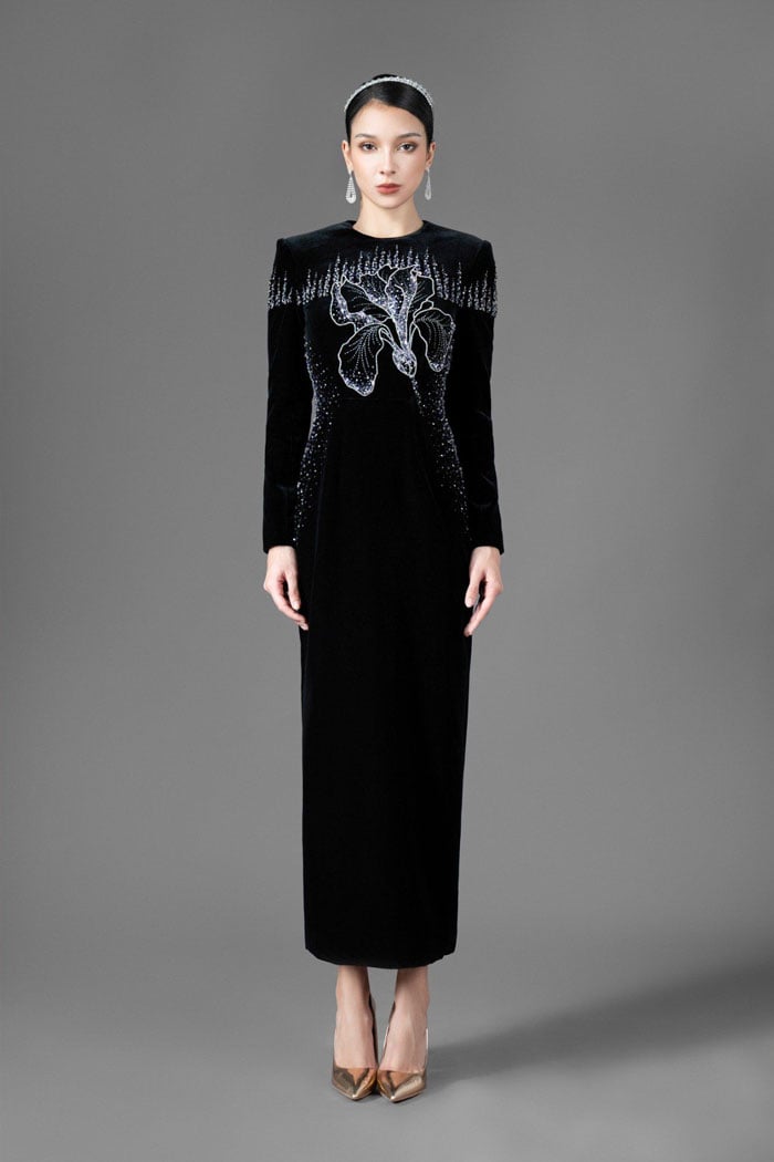 Những mẫu đầm dạ hội trung niên đẹp không ngừng gây ấn tượng với điểm nhấn đặc biệt là chi tiết thêu hoa tinh tế. Các bông hoa được nghệ nhân thêu cẩn thận, từ những bông nhỏ nhắn đến những cánh hoa lớn rực rỡ, đem đến một sự nổi bật và sang trọng.