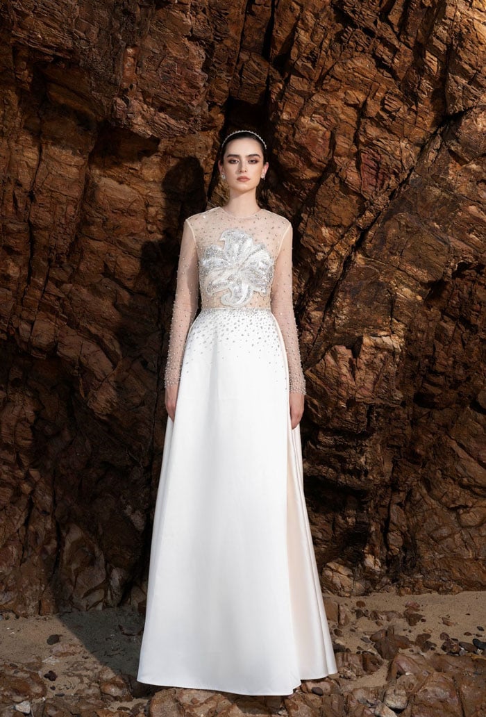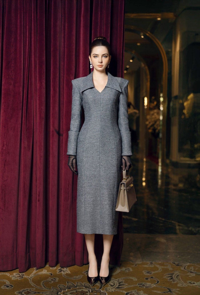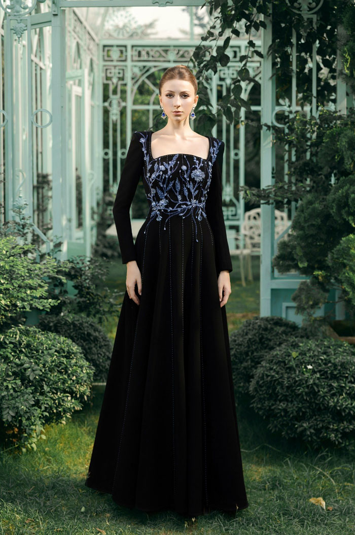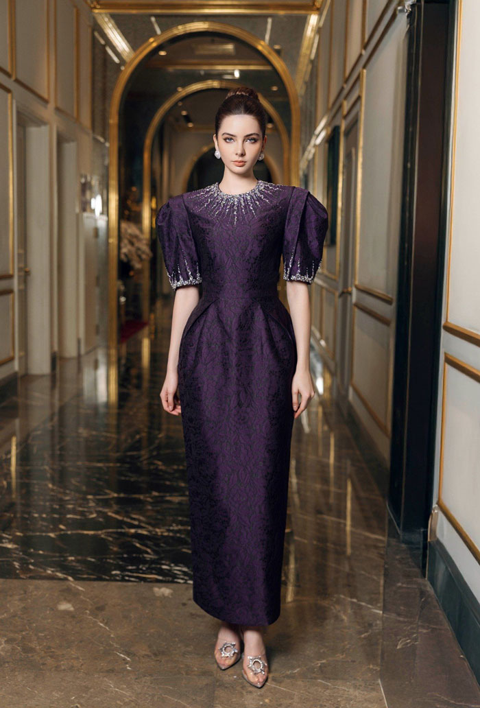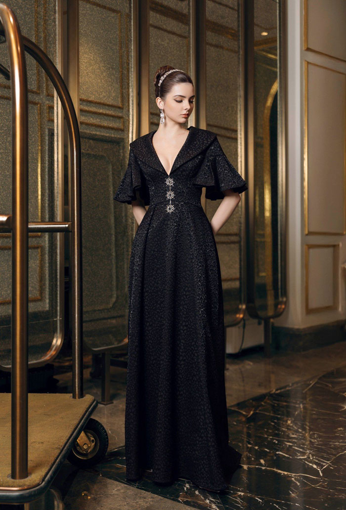 Dáng chữ A buông nhẹ về phía thân dưới, tạo cho người mặc cảm giác vừa vặn cho người phụ nữ Á Đông. Phần cổ tròn với phần vai đưa nhẹ vào được làm nổi bật trên nền hạt đá đính thủ công vừa cầu kỳ, vừa tinh tế.