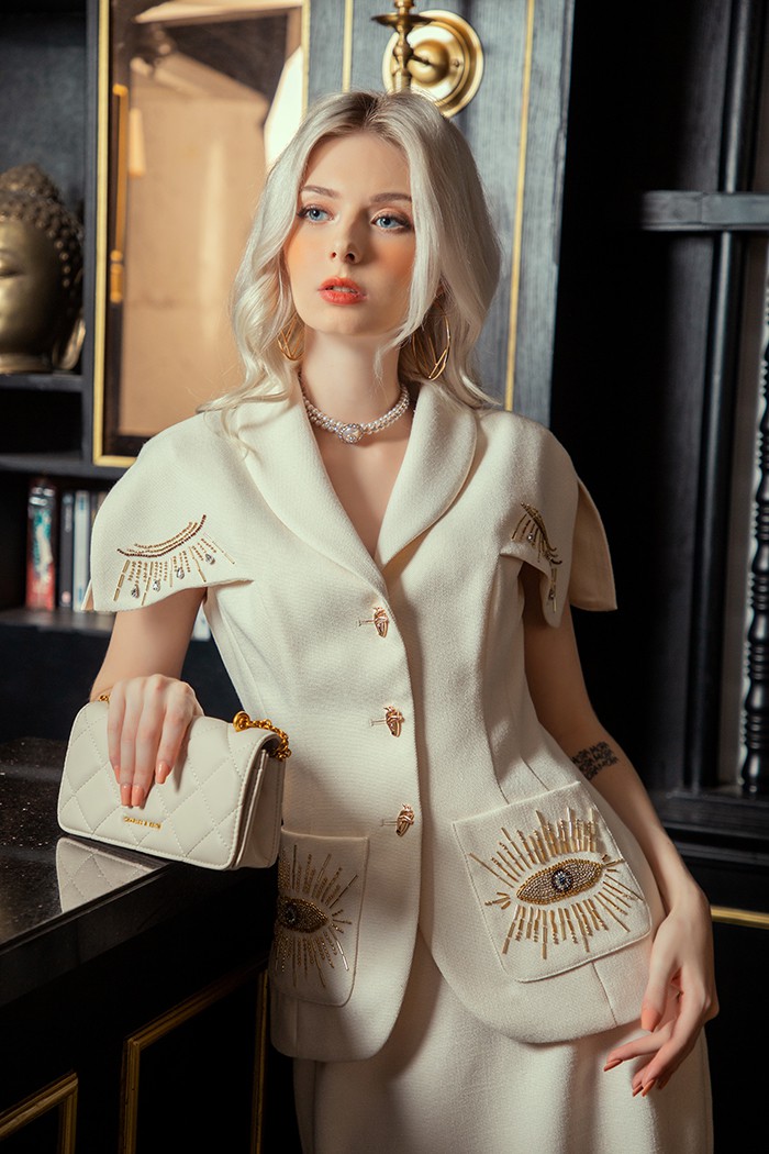 Áo Dorine là sản phẩm mang tính đột phá của bộ sưu tập Look At Her với sự pha trộn hài hòa của truyền thống và cách tân hiện đại. Dựa trên dáng áo vest cổ điển, các chuyên gia thiết kế đã cách tân để đem đến một siêu phẩm áo Dorine vô cùng lạ mắt. Đây là một trong các kiểu áo vest nữ tay lỡ độc đáo và sang trọng bậc nhất hiện nay. Áo được thiết kế với cổ vest 2 ve tạo hình cổ V tăng thêm phần quyến rũ. Phần tay áo được ví như nụ hoa đang hé nở tạo đường nét điệu đà. Thiết kế tay với đường xẻ từ vai giúp tăng thêm phần cá tính. Cùng với đó là vạt áo xẻ và hai túi được đính họa tiết đôi mắt vô cùng thời thượng. Lấy ý tưởng lông mi thêu củ công ở phần tay áo, kết hợp với đôi mắt long lanh được thêu tỉ mỉ ở phần thân áo tạo nên sự phá cách độc đáo. Các viên đá cũng được đính tỉ mỉ một tạo nên sự lấp lánh tạo hình tượng đôi mắt long lanh và có hồn. Điều này giúp thiết kế thêm phần trẻ trung, năng động mà vẫn giữ được sự dịu dàng, nữ tính.