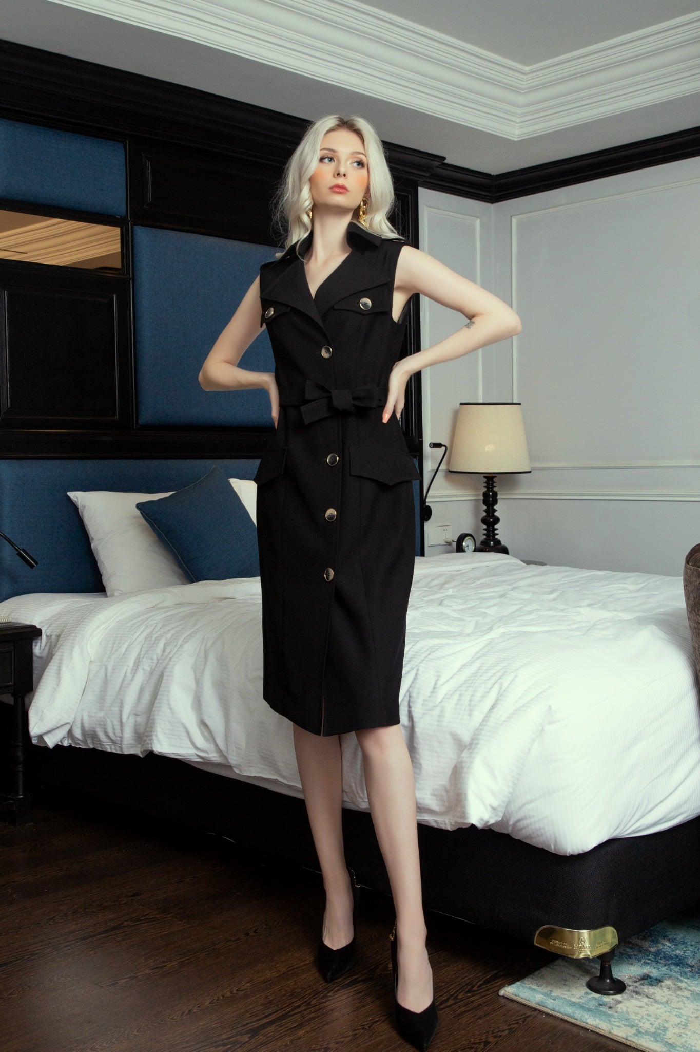 Thân trước có bổ nẹp giao cùng đường khuy cúc đồng ánh bạc sang trọng. Thiết kế 4 nắp túi thêm phần hiện đại, phá cách giúp nàng có được một gu thời trang mới trẻ trung và cá tính hơn. Thân váy được cách điệu bởi đai thắt nơ giúp bộ đồ thêm phần nữ tính và tạo đường cong mềm mại và quyến rũ hơn. Lớp lót lụa được may tỉ mỉ phía trong giúp tạo cảm giác thoải mái hơn, tăng khả năng thấm hút mồ hôi cũng như tăng thêm phần cứng cáp, lên form chuẩn cho áo.
