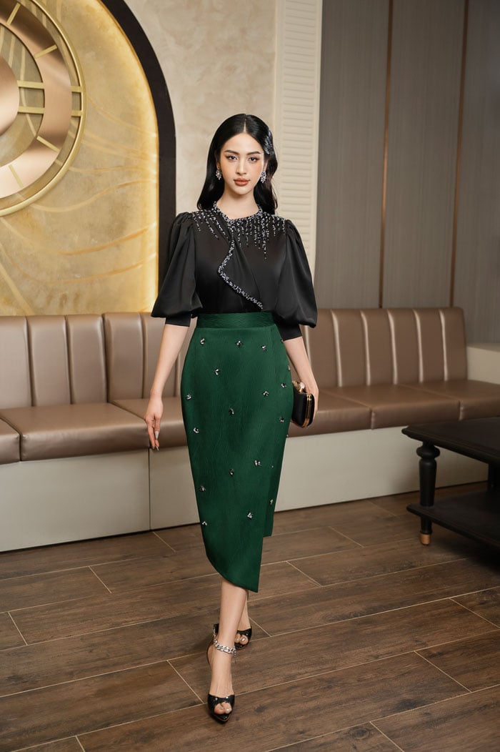 Chân váy Belle với dáng bút chì và vạt đắp đã mang tới nét quyến rũ và thanh lịch cho vóc dáng. Bản phối chân váy Belle với thiết kế áo tay phồng dáng lỡ, kèm họa tiết đính đá tạo nên sự tương đồng giữa chất liệu đá sang trọng, thanh lịch. Áo tay phồng tạo ra sự mềm mại và nhẹ nhàng, tôn lên vẻ đẹp và sự nữ tính của người mặc. Diện lên mình bộ cánh thu hút, phái đẹp càng thêm tự hào khi đã tin tưởng và lựa chọn sản phẩm thời trang thủ công đính kết mang giá trị nhân văn cao.