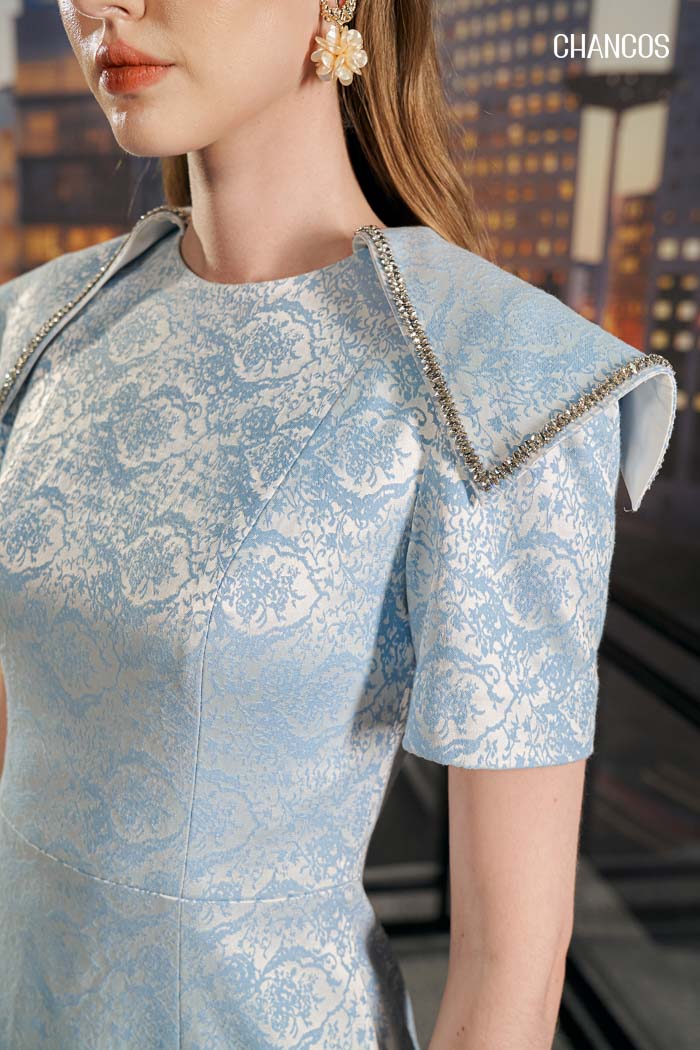 Đầm Eirlys không chỉ thu hút bởi thiết kế độc đáo mà còn bởi sự phong phú của màu sắc và họa tiết hoa văn. Trên nền vải mờ, họa tiết hoa văn tông xanh dương nhẹ nhàng như chiếm trọn mọi ánh nhìn, mang đến cảm giác cổ điển và lãng mạn. Màu sắc chủ đạo của đầm Eirlys là một sắc xanh mờ, tạo ra sự dịu nhẹ và thanh thoát. Màu xanh dương pastel được nâng cấp với mục đích thăng hạng nhan sắc, cho người phụ nữ dần chạm tới vẻ đẹp tự nhiên, không lai tạp. Họa tiết hoa văn tông xanh dương nhẹ là điểm nhấn quan trọng của đầm Eirlys. Những chi tiết hoa văn tinh tế và mềm mại, tạo nên sự hài hòa và cân đối. Họa tiết hoa văn hơi hướng cổ điển mang tới một vẻ đẹp lãng mạn và tinh tế, gợi nhớ đến thời kỳ thời trang vintage nữ.