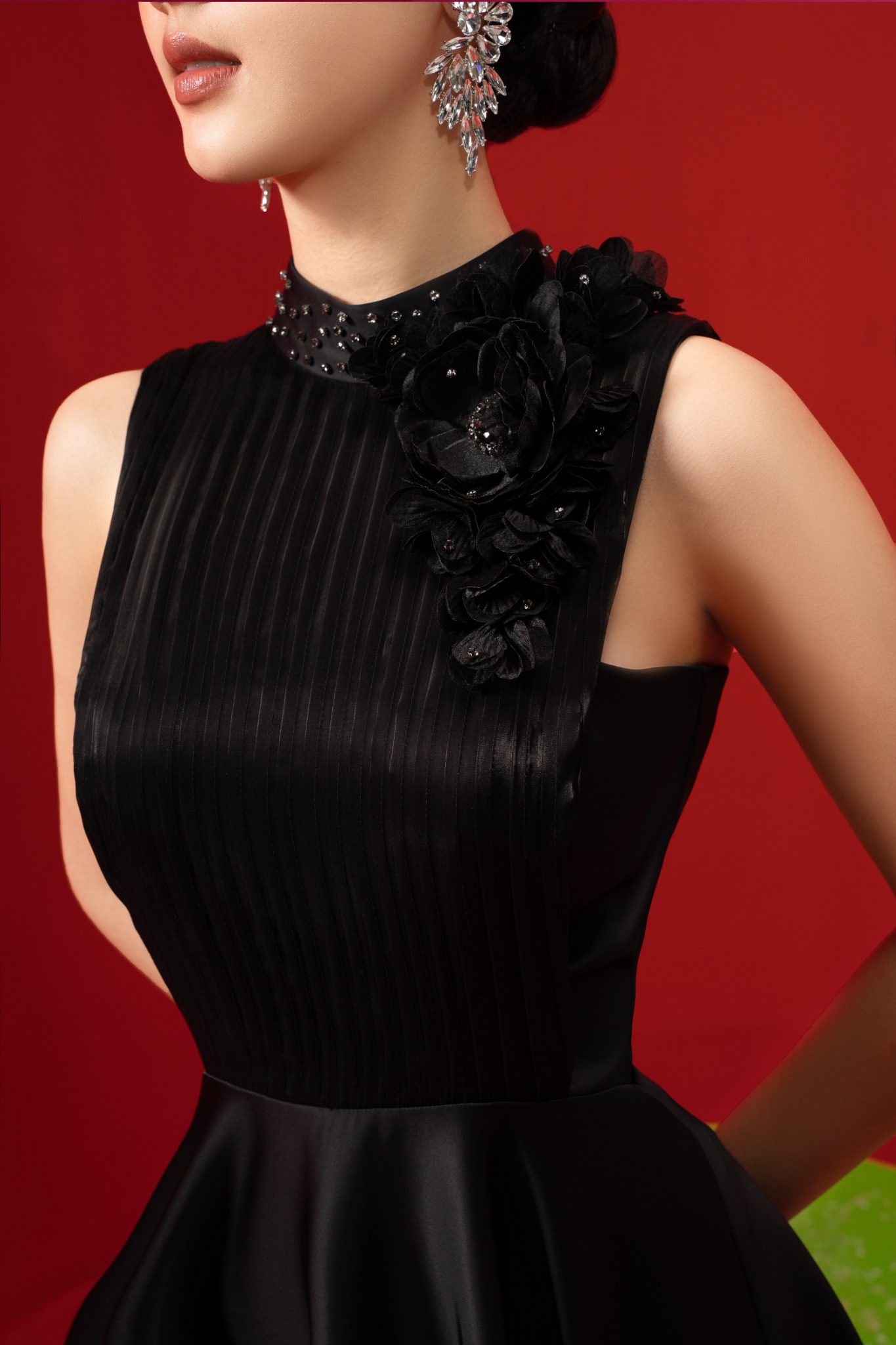 Điểm đặc biệt của thiết kế đầm Toulouse chính là phần cổ được cách tân trên nền áo yếm truyền thống. Cổ đứng ngay ngắn kết hợp với phần váy sát nách tăng thêm độ trẻ trung, thời thượng cho thiết kế. Cùng với đó là là các đường gân sóng mờ trước ngực tạo điểm nhấn sang trọng hơn. Phần cổ được đính đá tỉ mỉ vô cùng lấp lánh, kết hợp với họa tiết bông hoa được gắn liền bên cổ trái tạo nên điểm nhấn vô cùng nổi bật.