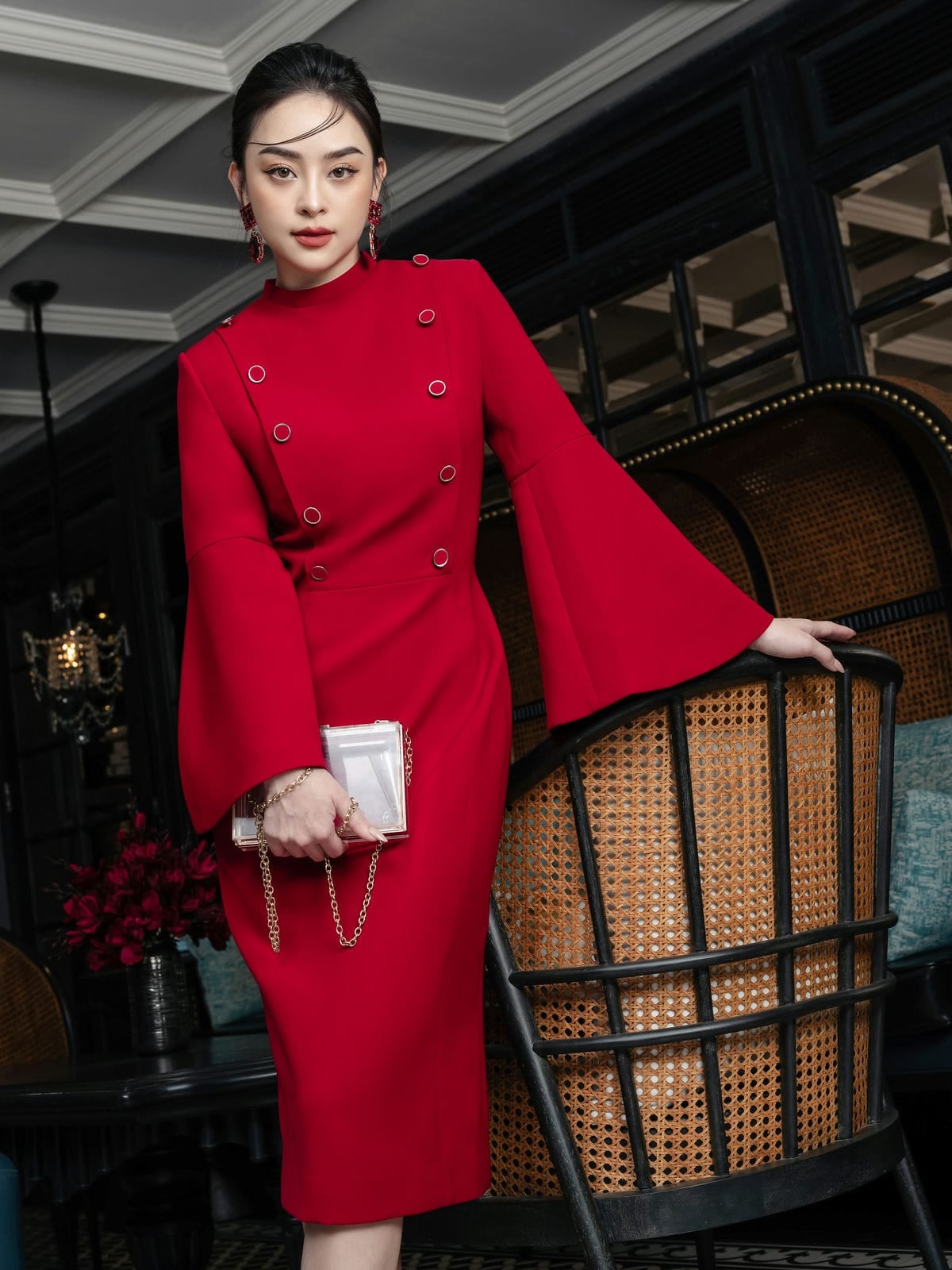 Với thiết kế đặc trưng, mang đậm phong cách thanh lịch quý phái của thời trang cao cấp Chancos, đầm Jacquelyne đem đến cho quý cô một lựa chọn mới cho phong cách thời trang tối giản. Dáng đầm midi ôm sát, tôn lên đường cong cơ thể. Dù thiết kế cổ tròn cao kín đáo với 2 hàng khuy trang nghiêm được lấy cảm hứng từ những bộ đồ sĩ quan quý tộc nhưng mẫu đầm vẫn giữ được nét mềm mại, nữ tính. Phần cổ được cách điệu đơn giản hơn nhưng vẫn giữ được tinh thần uy nghiêm, quý phái của bộ trang phục hoàng gia cổ điển. Tạo thêm điểm nhấn đặc sắc là hai hàng khuy được đính hoàn toàn thủ công. Điểm nhấn đặc biệt của đầm Jacquelyne chính là phần tay A xòe đầy nữ tính và sang trọng. Thiết kế này tạo nên hình bông hoa ly nở rộ, biến quý cô trở thành loài hoa ngát hương.